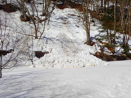 しかし急な山肌が迫ってきている箇所では、ところどころで雪崩の跡が確認出来ます。まだ2月ですが、暖かい日が続き積雪量も少ないためか底雪崩が発生しているようです。