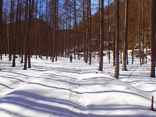 今年の奥日光は寡雪暖冬で、雲竜瀑も2月上旬には融けてしまいました。奥日光は降雪量も少なく、粉雪のラッセルは期待できませんが、この日は夜間の寒気で雪が凍結し締まっており、雪の林道も歩き易い状態となっています。