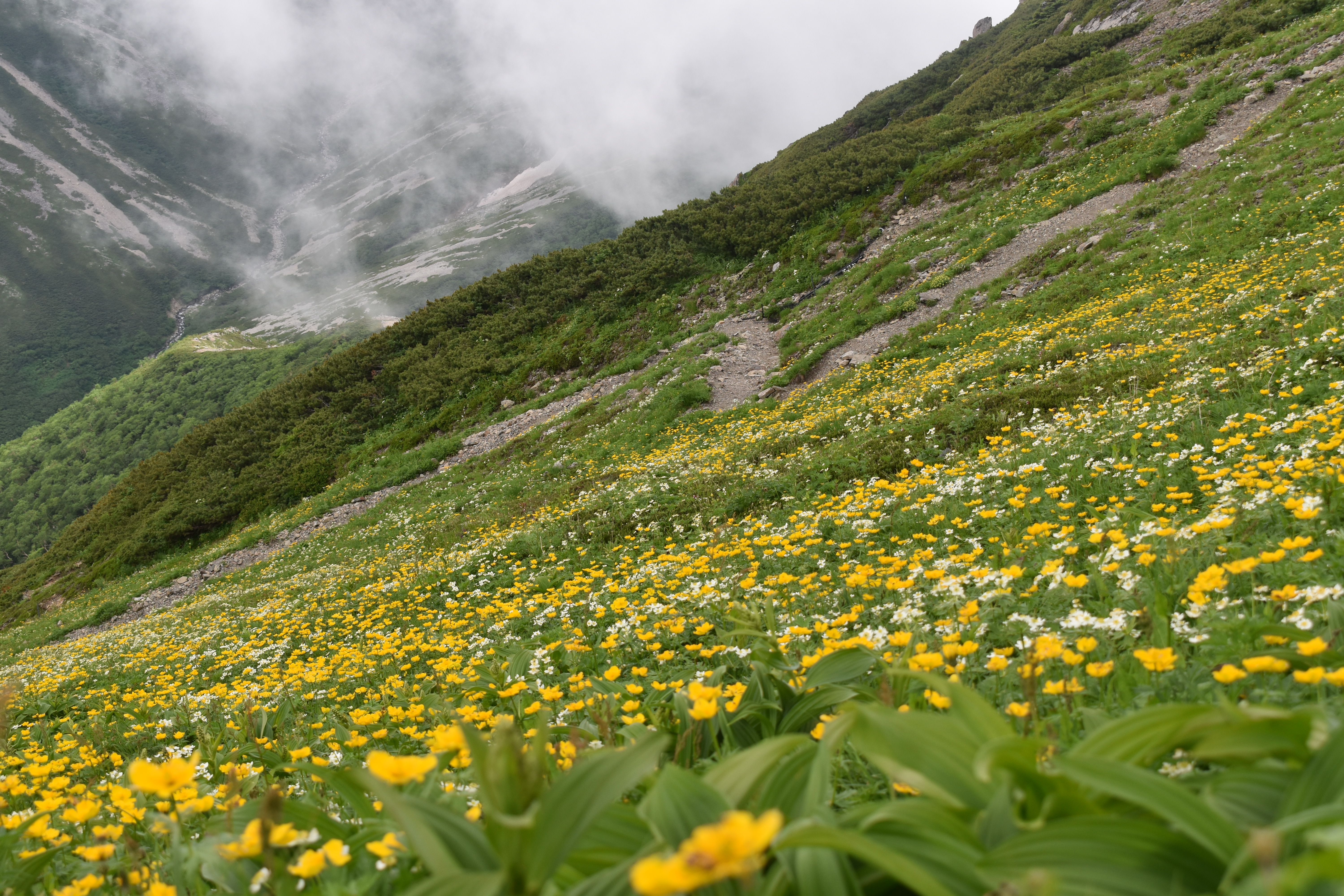 上の写真は荒川岳のお花畑です。黄色の点はシナノキンバイ、白の点はハクサンイチゲです。画像をクリックして大きくすると1つ1つの花がよく見えます。手前に見えるのも奥に見えるのも全て高山植物です。このお花畑を横切るように登山道があるので、間近で大大大群落楽しむことができます!このお花畑に来るまでにはかなりの時間を要しますが、この素晴らしいお花畑を見たら疲れも吹き飛びますね!