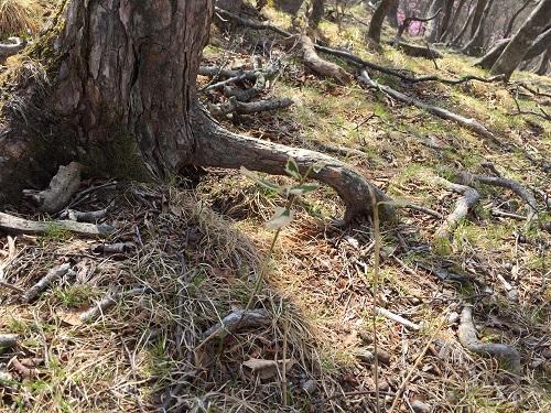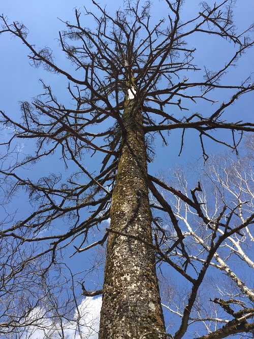 そして、私は、枯れ木や倒木にも目がとまり、特に写真にある立ち枯れ木は枯れてしまってもなお、生命力を感じました。枯れてしまった原因は、シカが樹皮を食害したことによるものや病気等、様々であると想定されますが、枯れ木や倒木も生態系では重要な役割を果たしています。キツツキ類の餌場となったり、倒木によってギャップができ、新しい樹種が生育できる環境になったりするので、枯れ木や倒木も自然の一部です。