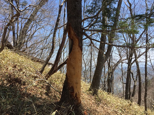 耳を澄ますと、ウグイス、ホトトギス、ツツドリ、ヒガラのさえずりが聞こえ、地面をみると、シカの糞やシカの食痕(ミヤコザサや樹皮)があります。双眼鏡等がなくても、野生動植物の生育、生息を感じとることができますので、みなさんもぜひ、いろいろな視点で山を歩いてみてください。