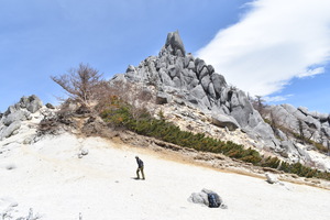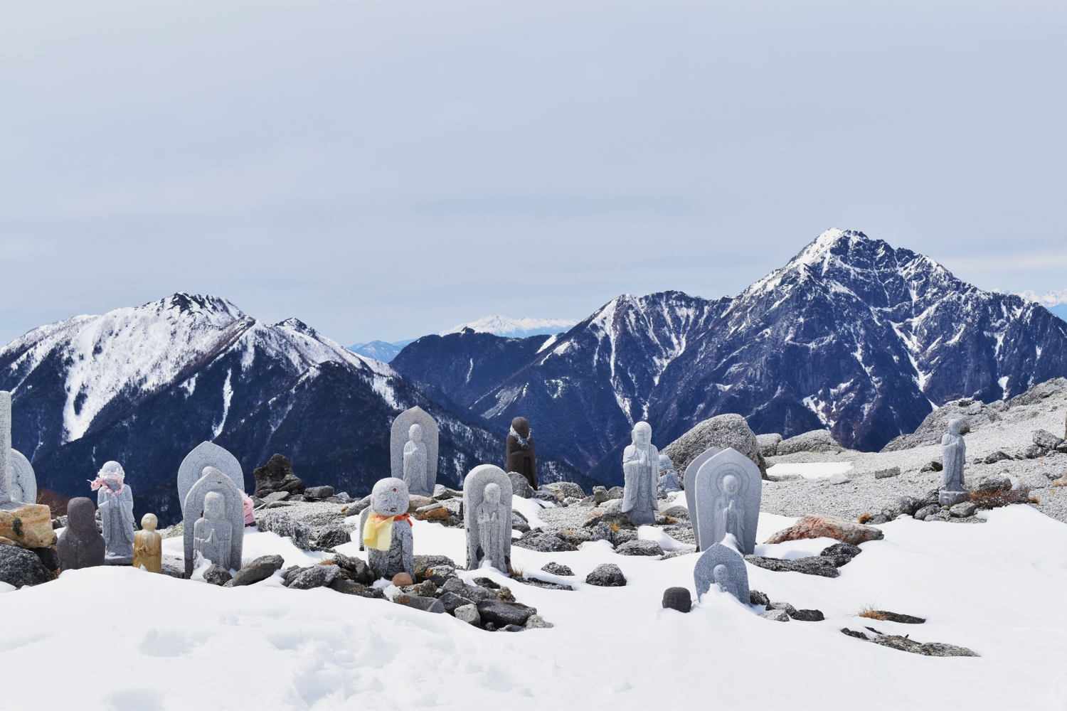 地蔵ヶ岳山頂直下にある「子授け地蔵」のみなさんです。足元が少し埋もれているお地蔵さんもあり、少し寒そうでした。後ろに見えるのは左が北岳、右が甲斐駒ヶ岳です。どちら雪で白いですね。北岳の真っ白な部分は大樺沢の左俣ルート方面です。毎年開山してからもしばらく雪が残る場所です。これだけ雪が多いので、今年は夏場でも雪を見ることができるかもしれませんね!