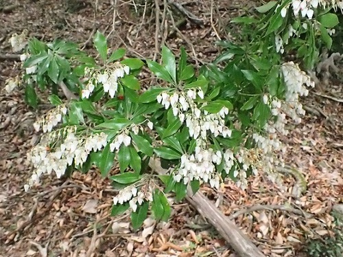 今回は花期を少し過ぎたはずのアセビも咲いていました。開花時期は2月下旬から5月初旬頃で、枝先に壺形の小花を下向きにたくさんつけます。漢字で書くと「馬酔木」と書き、馬が食べると酔ったようにフラフラとした足取りになることからこの名が付いたと言われています。葉や茎に有毒がありますが、白くて小さい花が風に揺れている姿を見ると可憐でかわいらしく思えてしまいます。