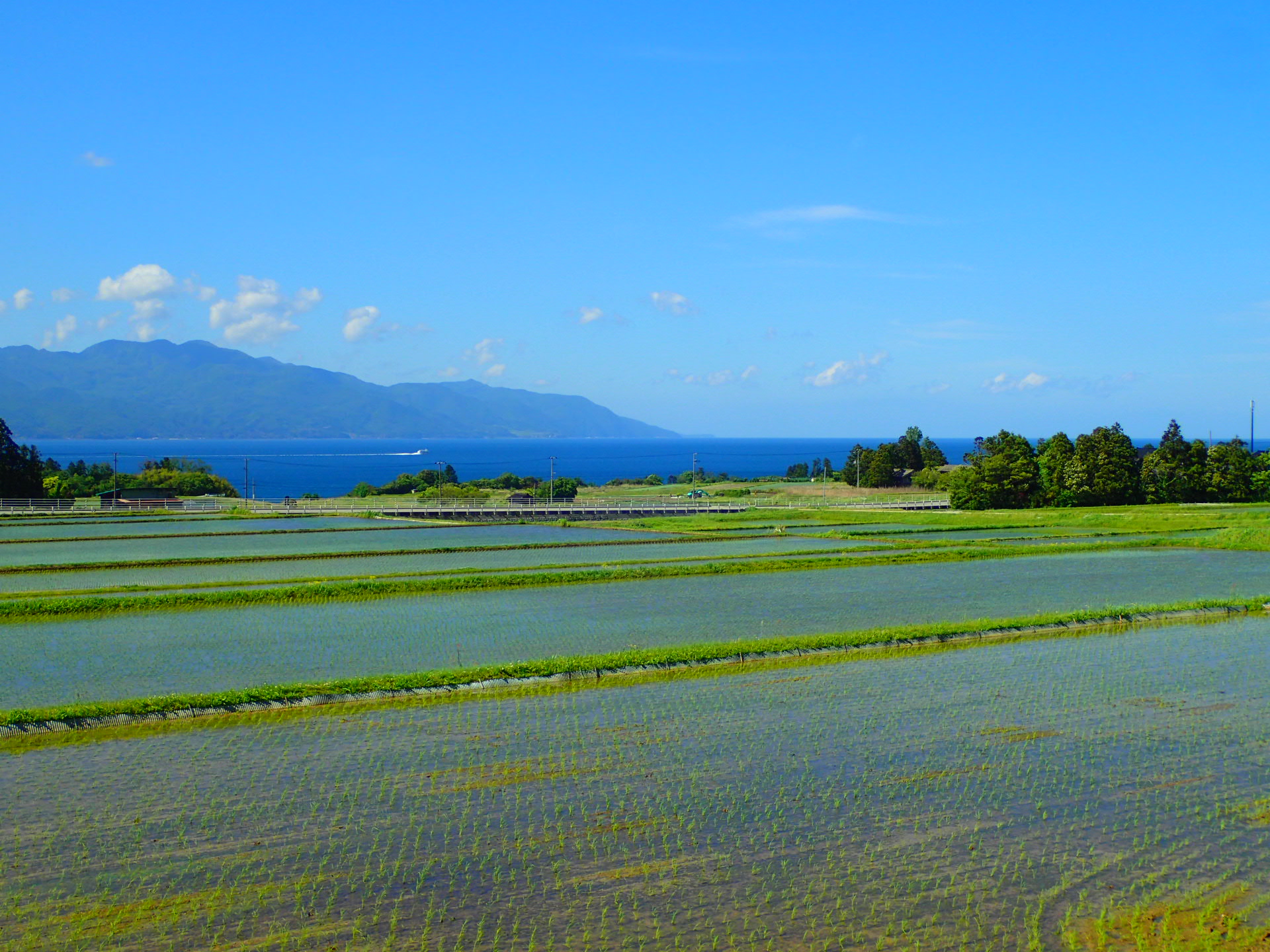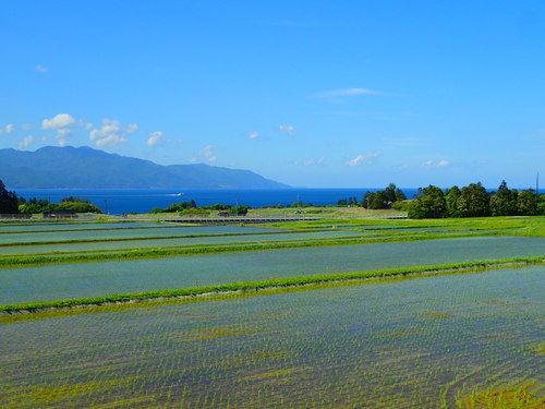 新潟県佐渡市では、田植えが行われ、美しい田園風景が広がっています。