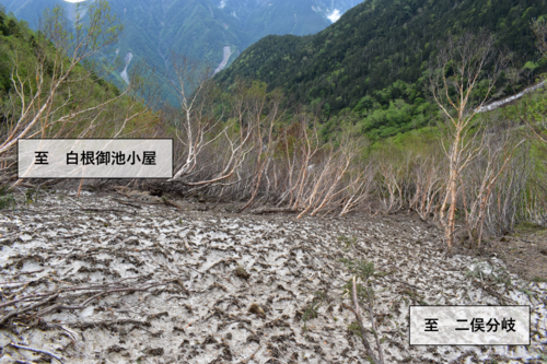 なお、二俣分岐の仮設トイレはまだ設置されておりませんので、大樺沢経由で登られる方は携帯トイレ、または、白根御池小屋のトイレを使用してください。