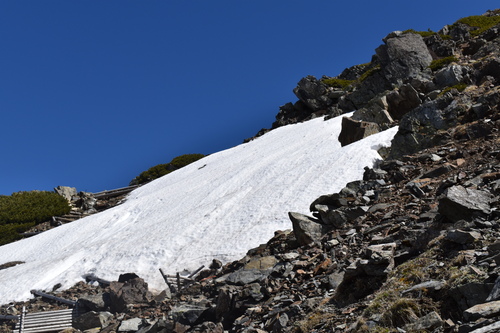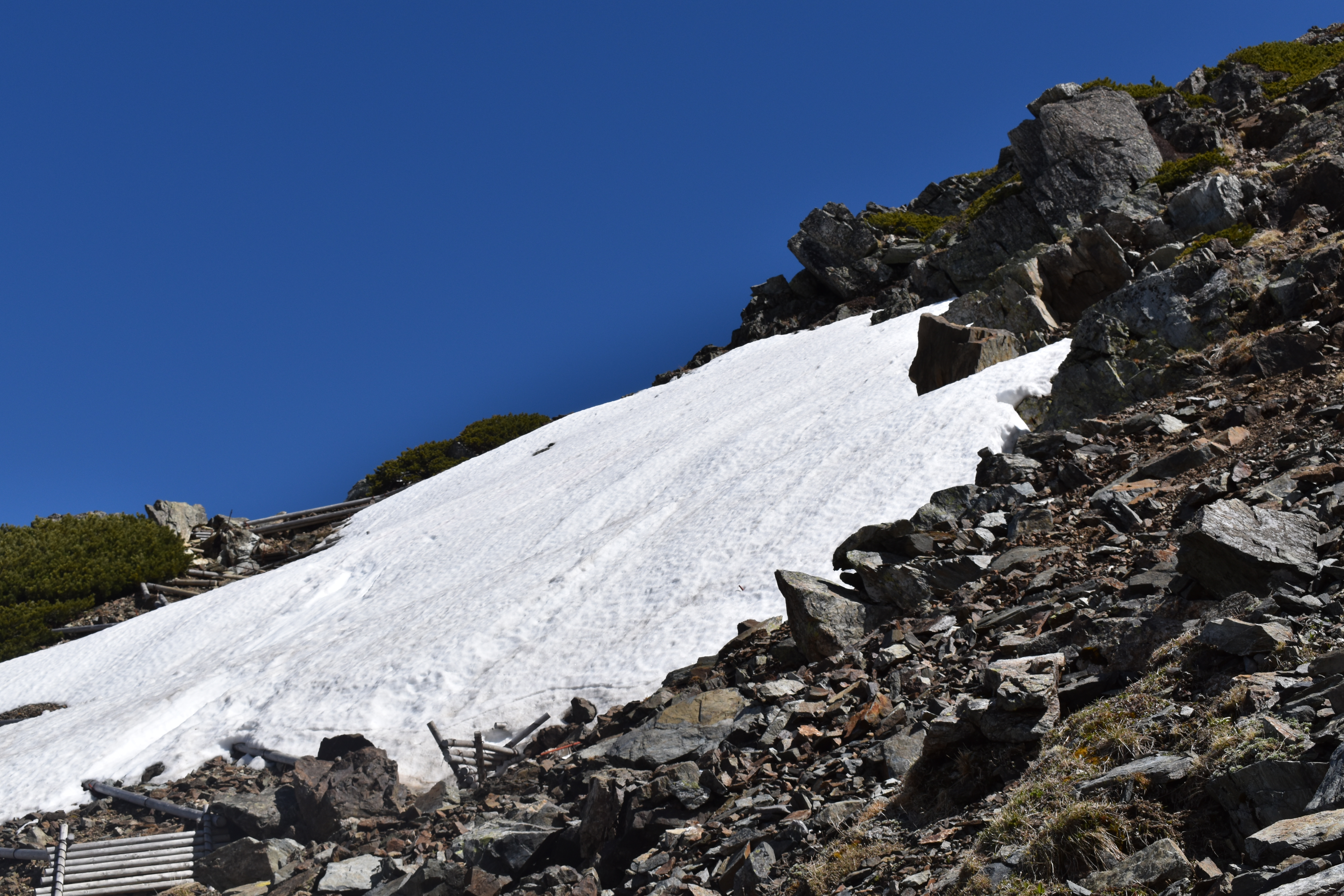 北岳山頂から吊尾根分岐に向かう途中の斜面に積雪があります。