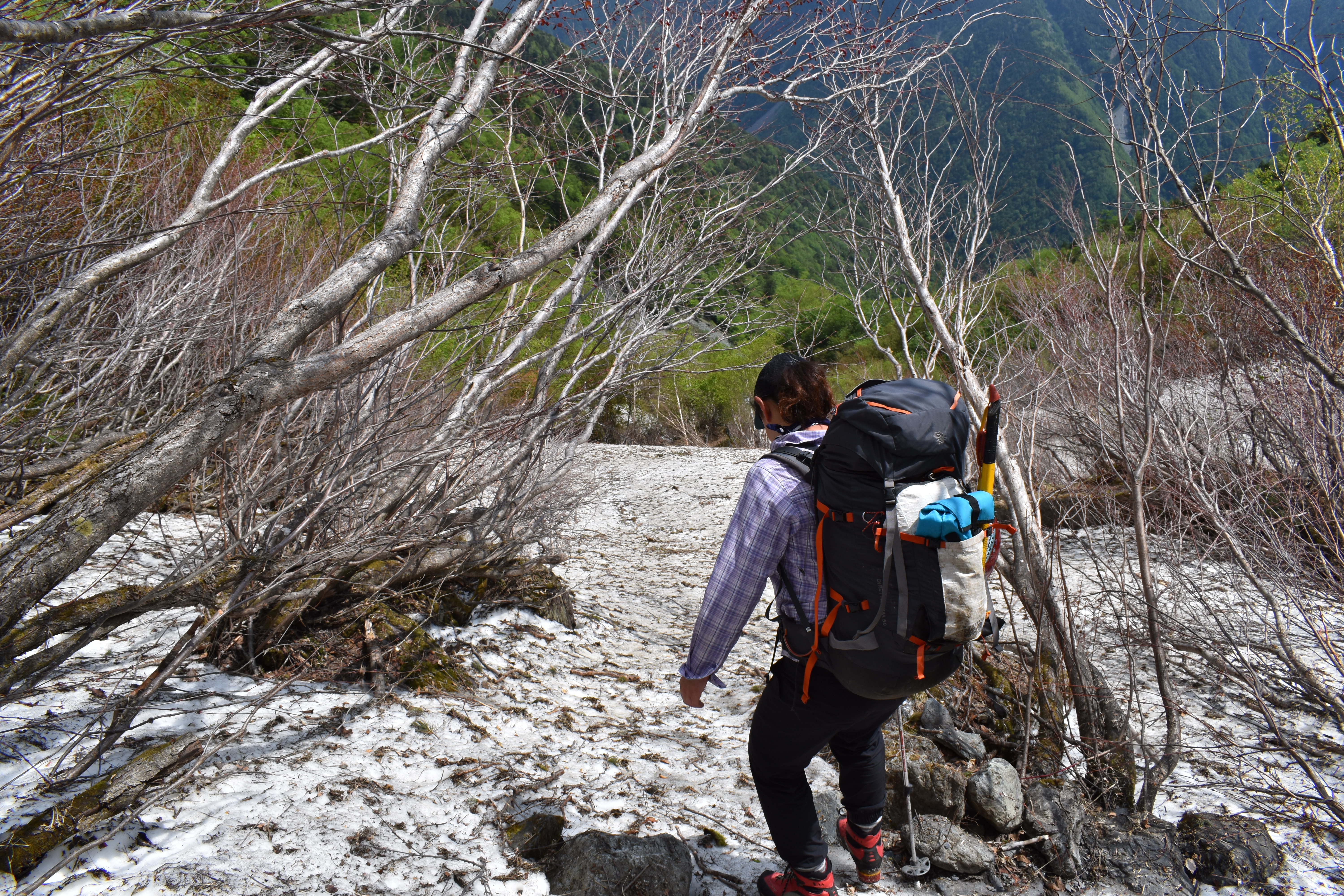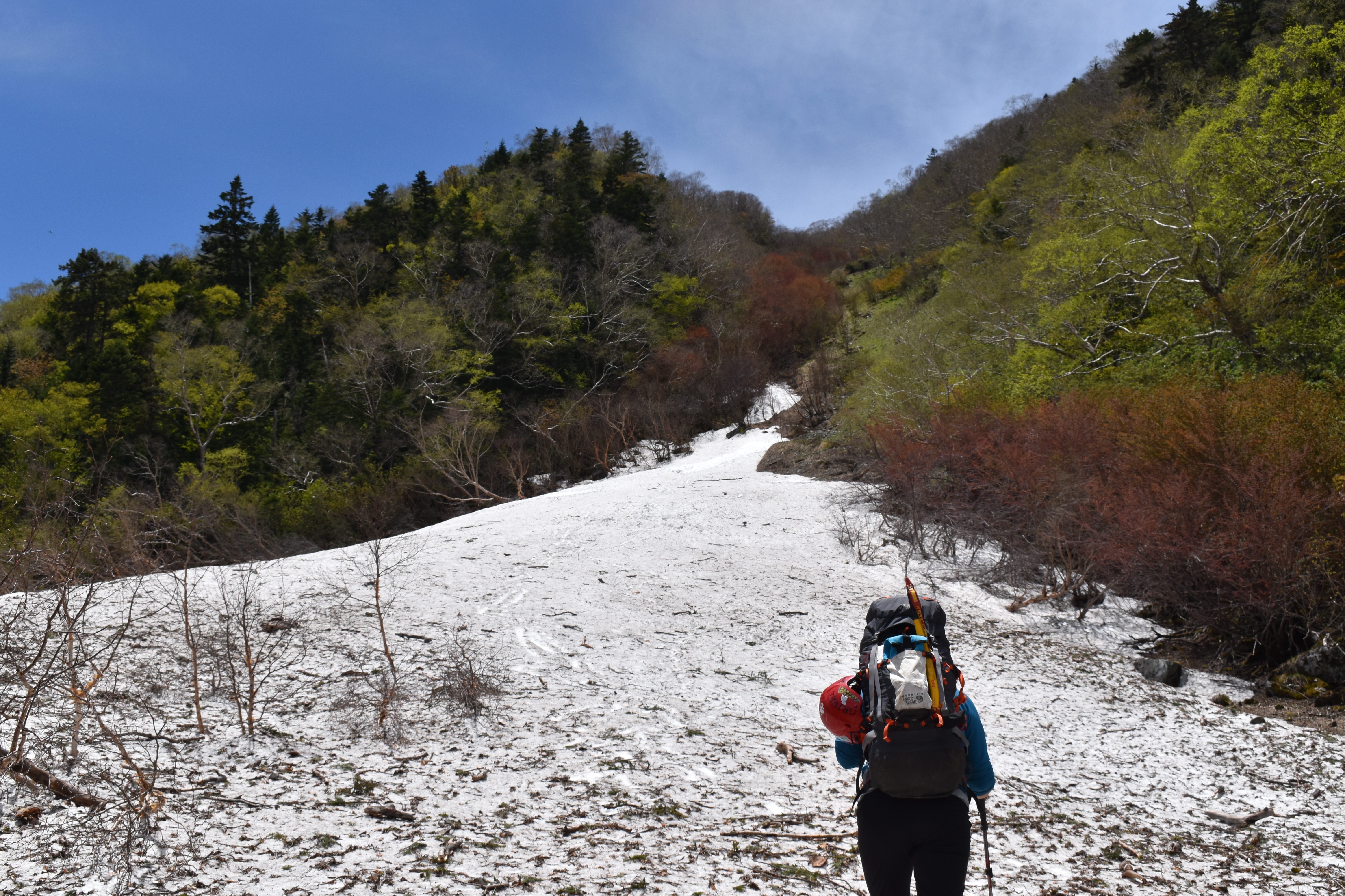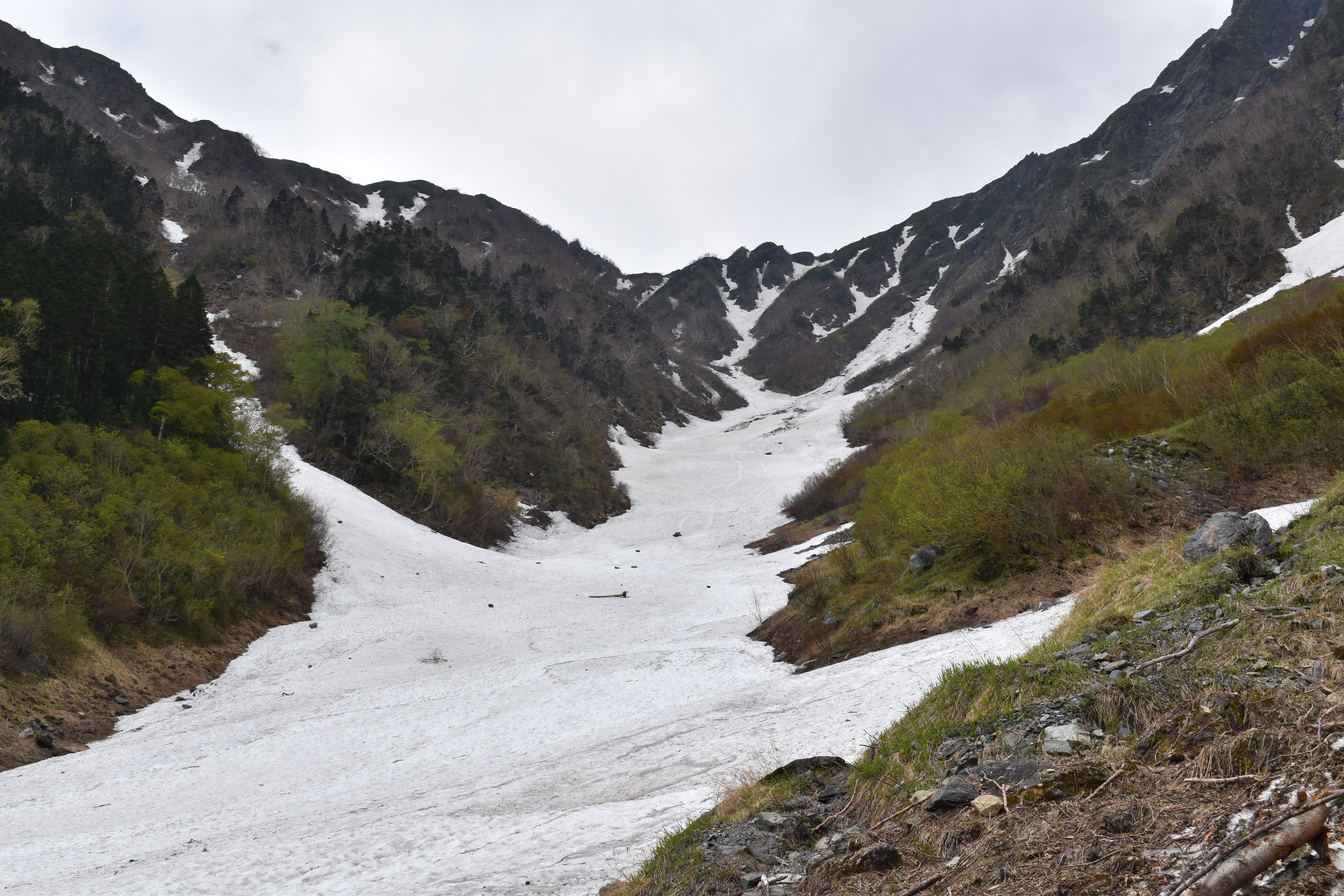 雪が多く、落石箇所も目立ちます。登り降りともに、12本アイゼン、ピッケル、ヘルメットを必ず携帯してください。昨年の同時期には下山中に事故が発生しています。この雪渓は二俣分岐より下まで続いていますが、雪渓の下には川が流れています。いつまでも雪渓を歩いていると川に落下する可能性もありますので、注意してください。