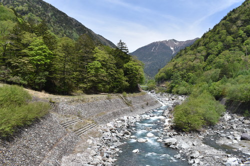 広河原から奈良田(早川町方面)に抜ける橋の上から野呂川の上流部を撮影しました。奥に見える山は栗沢山です。頂上付近がほんの少しだけ白くなっていますね。(栗沢山についてはコチラ)川を流れる水の音、鮮やかな新緑に心が癒やされました♪