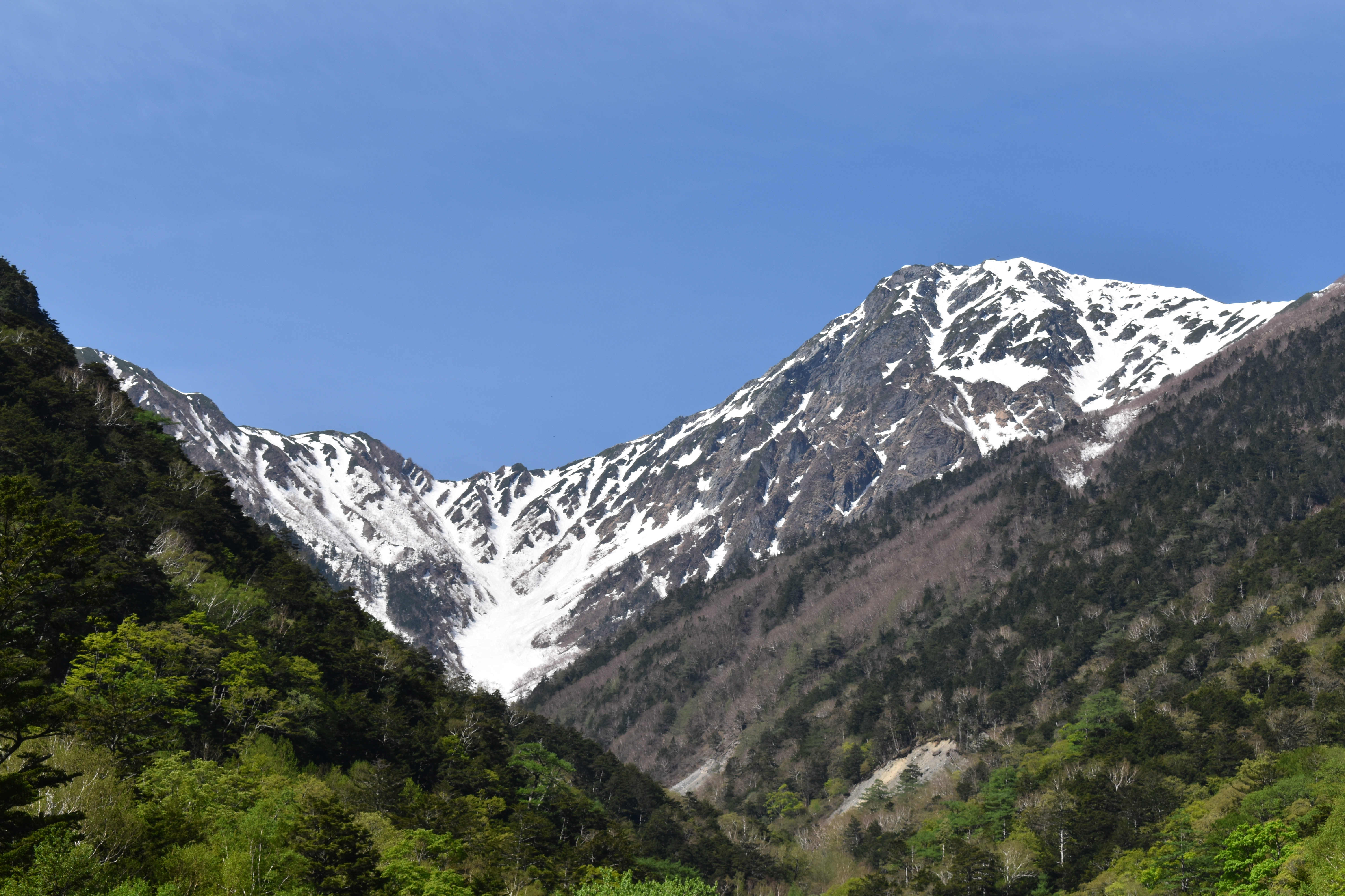 広河原からみた北岳です。白い筋は大樺沢の左俣ルートと呼ばれる主要ルートの1つです。まだまだしっかりと雪がついていますね!開山後もこのあたりでは残雪を楽しむことができます。あまり雪がなく、黒っぽい斜面は北岳山頂へ続く、高さ約600mの「バットレス」と呼ばれている岩登りの対象の大岩壁です。左俣ルートを歩いているとクライマーが登っているときもあります!開山後、左俣ルートでの登頂を目指す方は、12本アイゼンとピッケル等の冬山装備が必要です!
