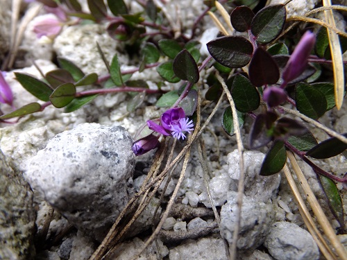岩の隙間に咲くヒメハギ。花のつくりが個性的です。