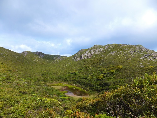 火山の噴火後、最初に育ち始めたのがオオシマツツジでした。そこに他の植物の種が飛んできて根付き、強風に耐えながら育った結果、半球系の緑の島ができあがりました。
