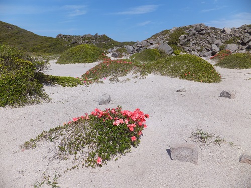 山頂部東側と中央部には、「白い砂漠(表砂漠・裏砂漠)」が広がっています。オオシマツツジを中心とした「緑の島」が点在する様子は、ここでしか見られない独特の風景です。