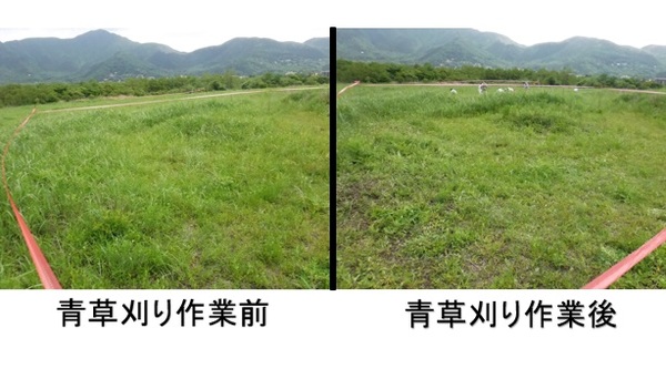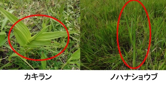 青草を刈る際には基本は足下で刈りますが、ノハナショウブがある場合などは傷つけないように地上高50㎝くらいで刈ります。
