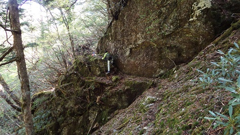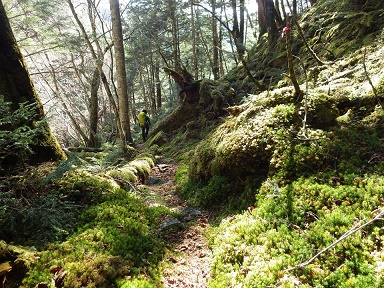 十文字峠から埼玉県側に下ると、急峻な岩場と苔むした原生林の道がしばらく続きます。