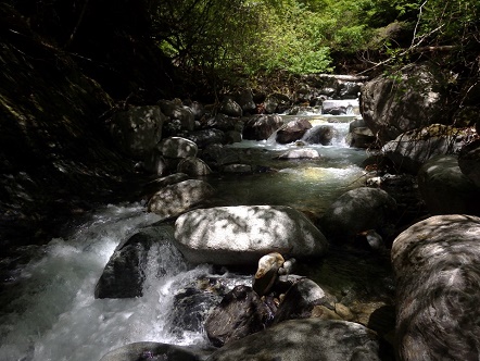 最後まで気の抜けない登山道を下り、赤沢吊り橋を渡ると、入川と赤沢の合流部に着きます。