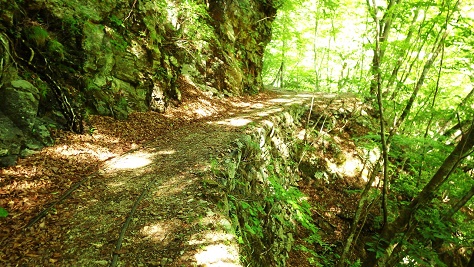 入川と赤沢の合流部から下流は、かつて木材を運んでいた森林軌道跡が残されています。
