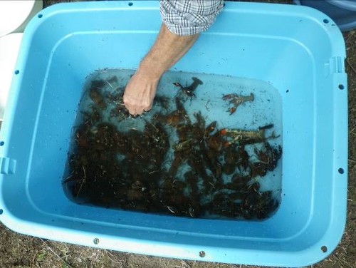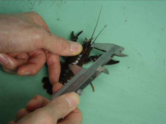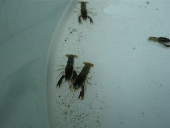 捕獲後は性別毎に仕分けして、体長を計測。その後は殺処分しました。参加者のお話によると、調査活動開始時と比べると大きな個体の数が減ってきているとのこと。一方、稚ザリガニも30個体ほど捕獲されており(メス1個体の抱卵数は120~200粒とのこと)、今後も活動を継続していく必要性を感じました。