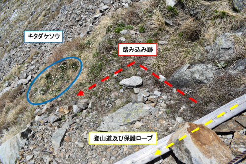 キタダケソウをはじめ、南アルプス山域には南アルプスにしか生育していない固有種や数多くの高山植物が生育しています。撮影に夢中になってしまったせいか、ロープを超え、踏み込んだであろう形跡が残っていました。