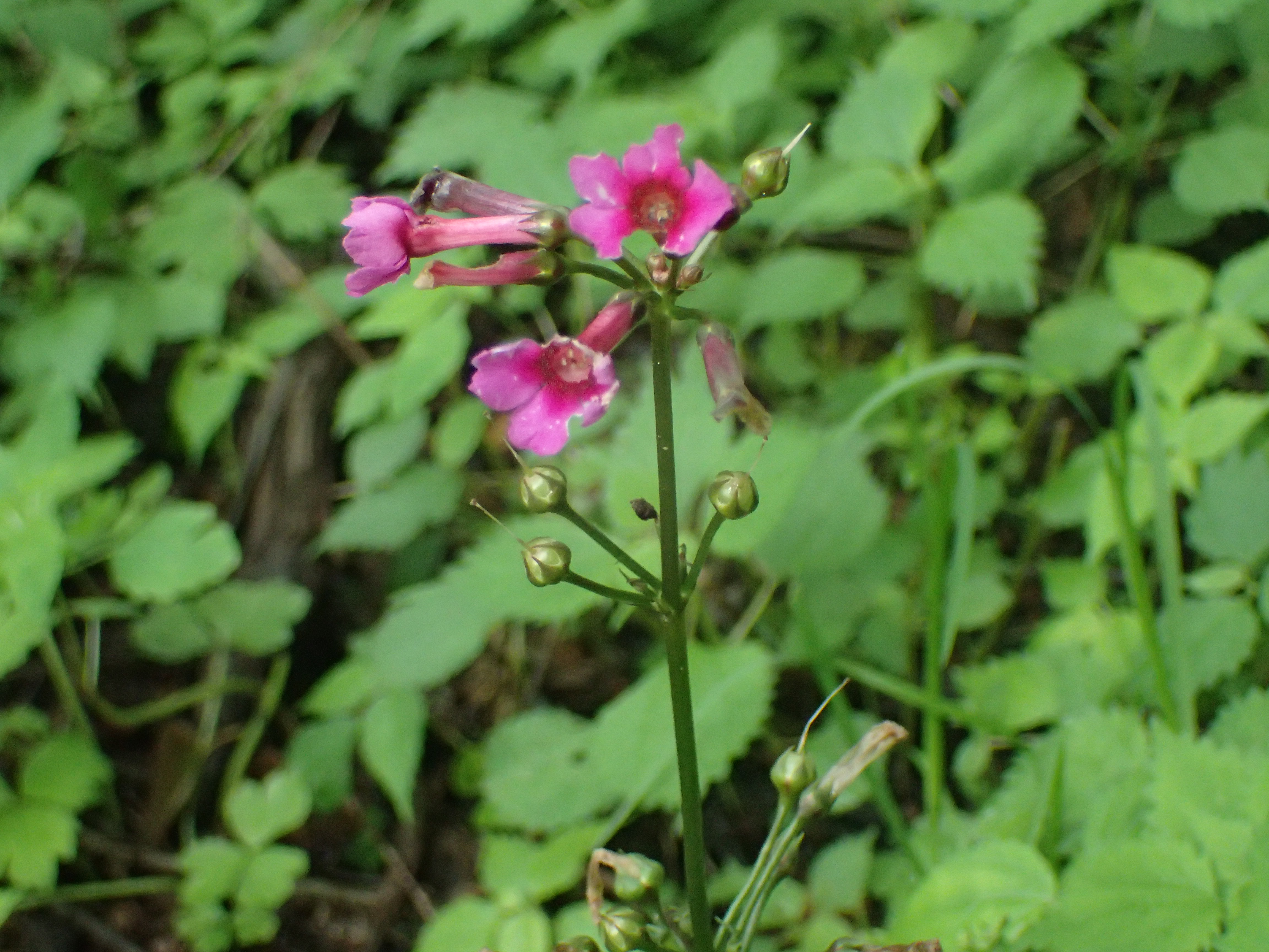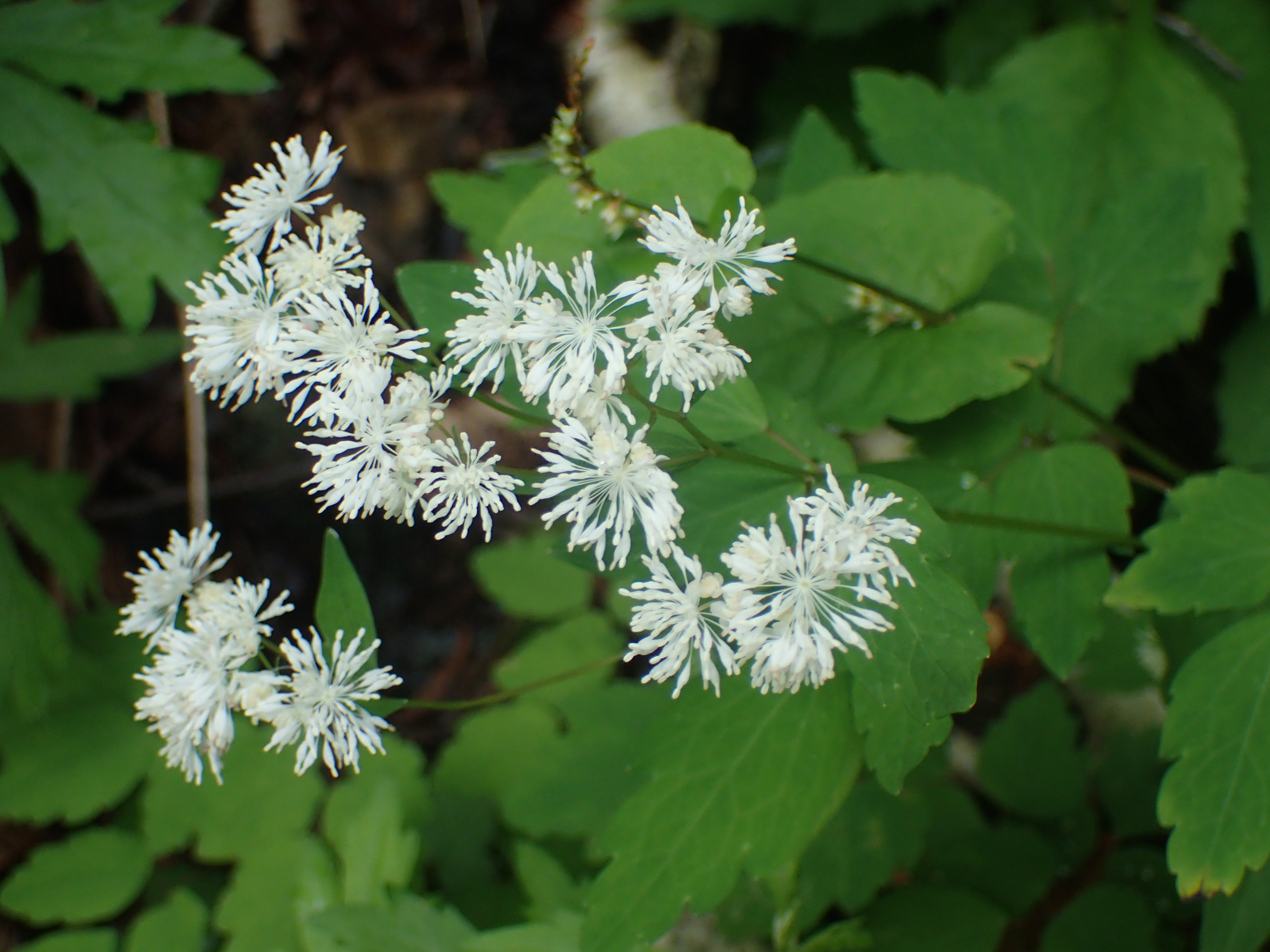 左はカラマツソウです。葉がカラマツの葉のような形をしていて、白い部分が雄しべの一部分になっています。1本1本が細かく、放射状になっているのが特徴的です。空がどんより曇っていても際立つ白さなのですぐに見るけることができると思います。右はクリンソウです。すっと伸びた茎の先に紅紫色の花を付け、日が当たる水辺に咲いていることが多いです。
