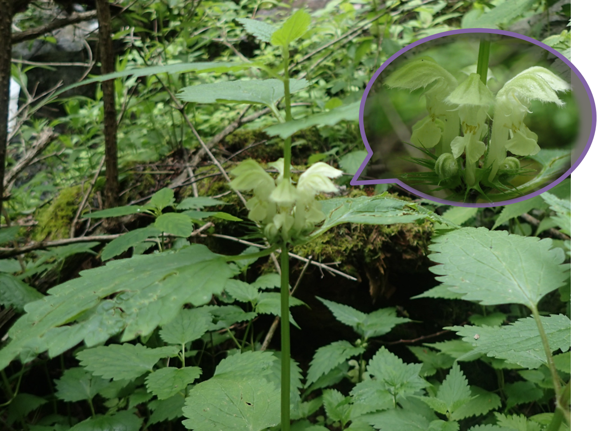 なんの花かお分かりでしょうか。オドリコソウです。花の形が傘をかぶって可燐に踊る女の子のように見えることが由来だそうです。アップで見ると細かく毛が生えているのが分かりますね。登るたび、探していましたが毎回見つけられず...。アクティブ・レンジャー3年目でやっと見つけることができました!
