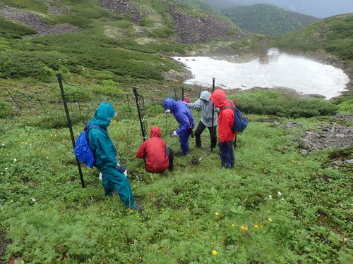 7月19日から21日にかけて、荒川岳に設置している防鹿柵の立ち上げ作業を行いました。荒川岳には、前岳と中岳の分岐を下った登山道下の西カール底と前岳南東斜面の2カ所に防鹿柵を設置しています。この2カ所は荒川岳の重要な景観を構成している場所であることから、お花畑を守るために平成23年度より設置しています。