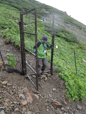 前岳南東斜面のお花畑に設置している防鹿柵は登山道を横断しているので、出入口に扉が設置されています。南アルプス山域で登山道を横断するように防鹿柵を設置している場所はこの荒川岳のみです。扉が開けっ放しになっているとニホンジカが入ってきてしまう恐れがあり、ニホンジカが入ってしまっては、防鹿柵を設置している意味がなくなってしまいます。