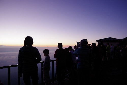 刻々と色の変わる空と雲海を見ながら御来光を待つ人たち@吉田ルート七合目山小屋
