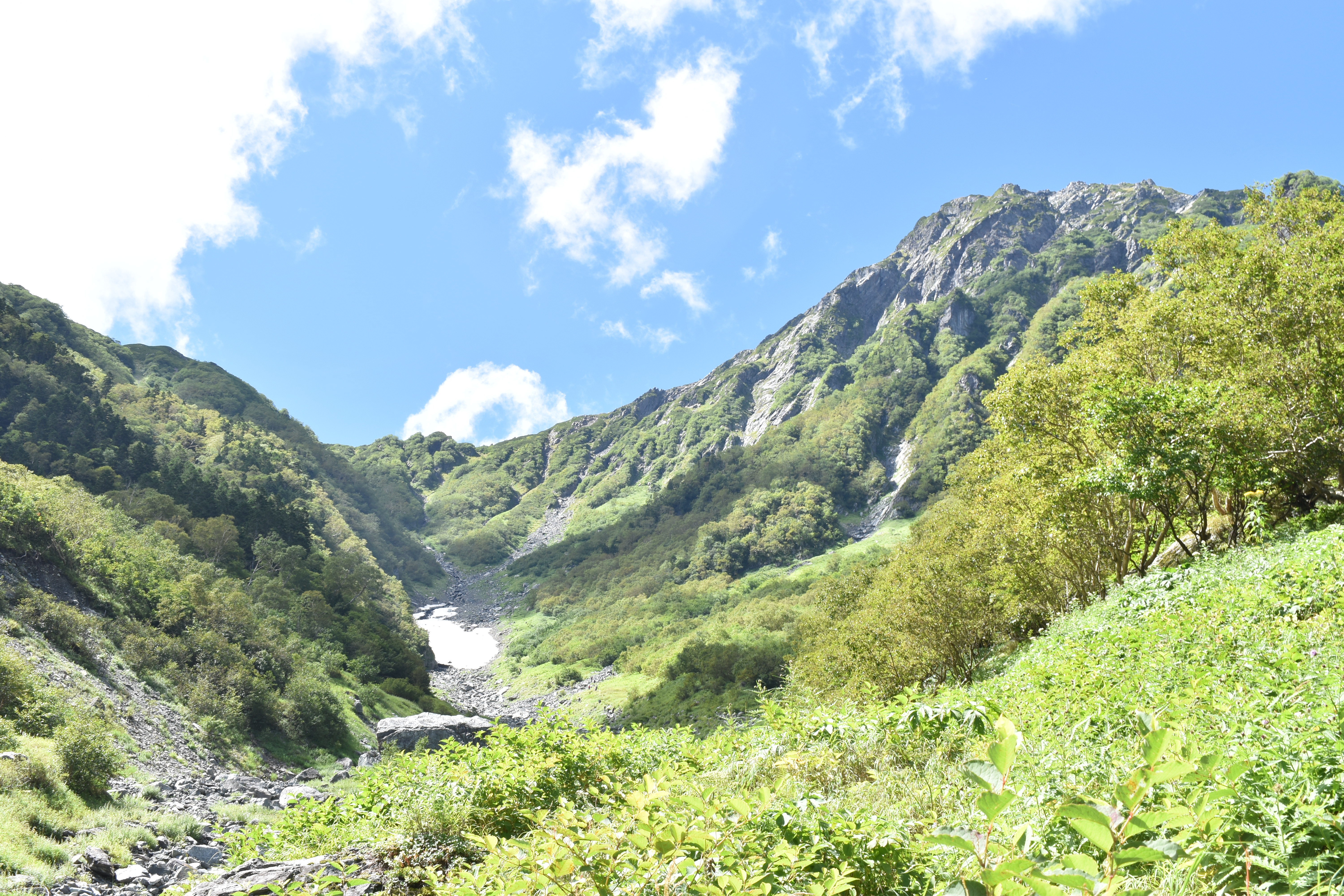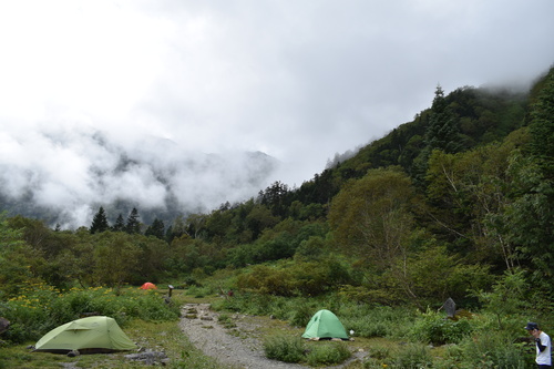 この日は広河原からも北岳山頂がよく見えて、大樺沢ルートを歩いている最中も北岳を見ながら歩くことができました!雨が続いていたせいか、登山道には水が流れこんでいました。靴底が濡れたまま岩の上を歩くと滑ることもありますので、歩行の際は十分に気をつけてくださいね。登山道脇ではトリカブトやサラシナショウマ、二俣周辺にはキオンやミヤマアキノキリンソウ、ヤマハハコが咲いていました。