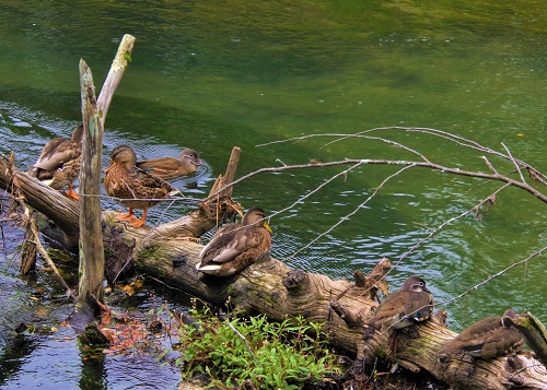 非繁殖期のオスはエクリプスと呼ばれ、メスと同じような羽色になりますが、くちばしの色で区別できます。右側3羽目がマガモのオス、その左隣がメスです。