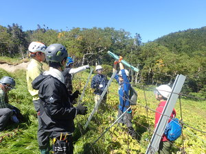初日は三伏峠の防鹿柵に設置されている通年設置の防鹿柵の修繕を行いました。通年設置の防鹿柵は季節型の防鹿柵と違ってポールからネットを外すという作業ではなく、雪圧でひしゃげてしまった支柱の打ち直しや高さが足りなくなっている金網部分を持ち上げる作業を行いました。元々はまっすぐ設置されていた支柱や金網は雪圧でぐにゃと曲がっており、大人1人の力でも修復が難しい状態でした。雪圧恐るべし。