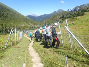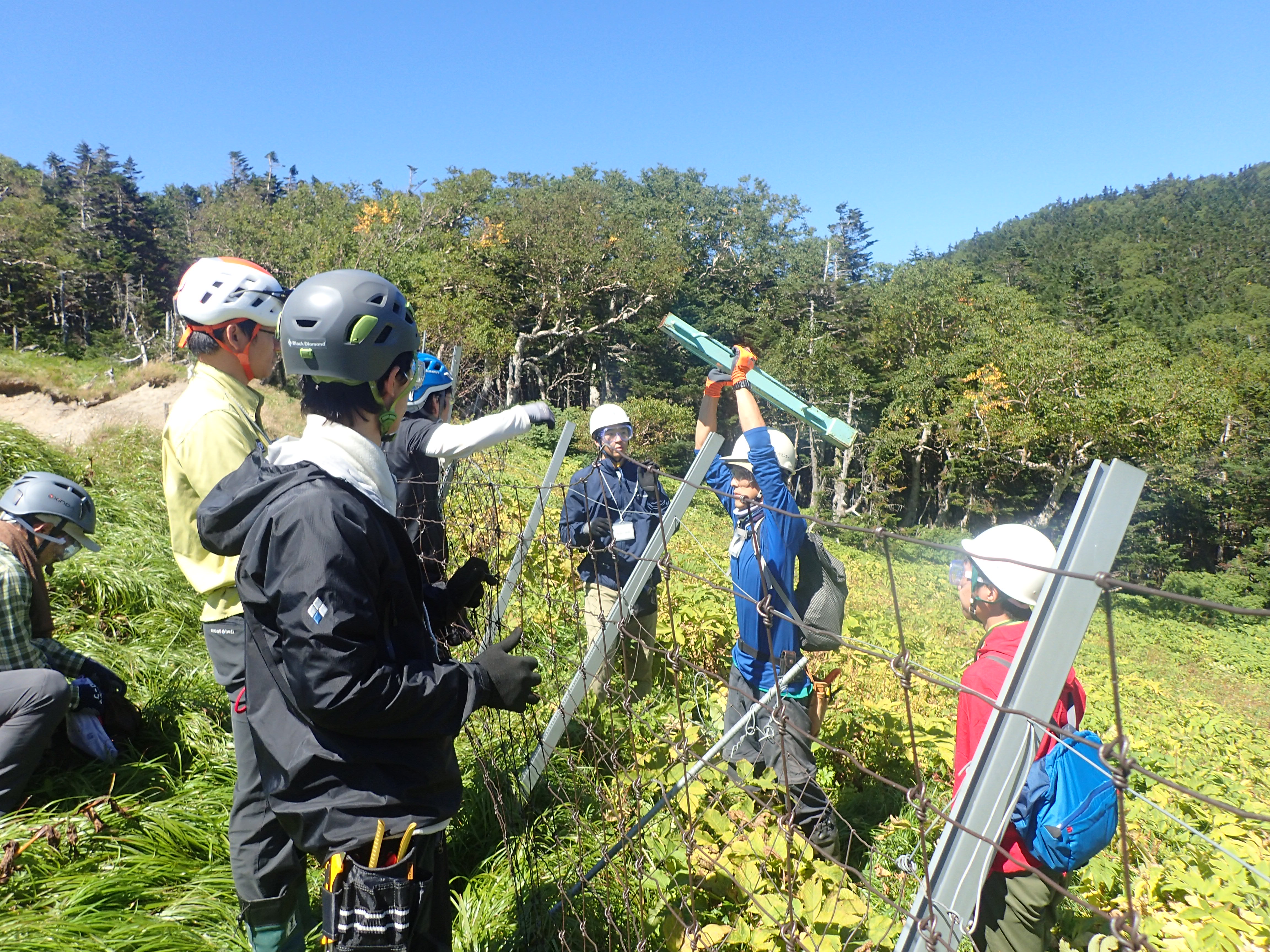 金網の修復で金網が目に飛んだり、支柱の打ち直しで頭に支柱や杭打機が当たるのを防ぐために、作業時はゴーグルとヘルメットを、もちろん足元は高山植物への影響を少なくするために地下足袋着用です。三伏峠・塩見岳の作業では社会人だけでなく、大学生や高校生も参加してくれたので、大人数で作業を進めることができ、あっという間に作業が終了しました。