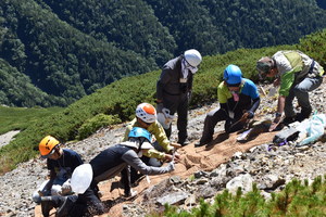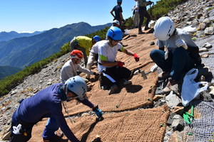 塩見岳直下のガレ場や東峰斜面のきつい傾斜での作業で落石による事故防止のため、この作業でもヘルメットは必須。すでにむき出しになっている斜面は傾斜がきつく、足元が非常に悪いです。四隅や途中部分に張りピンを木槌で打ち、シュロ縄で固定します。最後に石を置いて完成です。マットで覆うことによって土壌が流れにくくなるほか、保温性を高めることができます。地面の温度変化が穏やかになると、飛んできた種から芽が出やすくなる効果もあります。石はマットを押さえるだけでなく、石によってできる影によって、日影を好む植物、日向を好む植物がそれぞれ育ちやすくなるそうです。