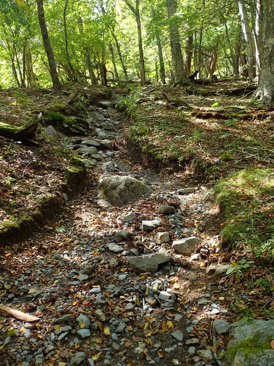 一見、なんの変化もないように見える登山道。広河原から北岳方面に登る際に必ず通過する登山道です。写真を拡大してみると小石がたくさん。そして、隙間を埋めるように流れてきている砂。白根御池小屋と大樺沢の分岐の間にはいくつか沢があり、登山道にあふれてあることはよくありますが、こんなに小石や砂が流れてくるほどの水量ではありません。台風通過中、この登山道が水の流れ道になってしまっていたようです。