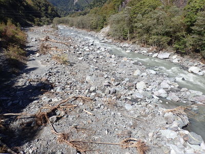 川のようすが変わってしまっています。川の真ん中に生えていた植物もすべて流され、土砂だけが残っています。河川の入り口が砂浜に変わってしまいました。台風通過中は川の一面を茶色の水で覆い、御勅使川と同様、石が見えないくらいの水量だったようです。山小屋のスタッフの方々は本当に恐ろしい思いをされたと思います。