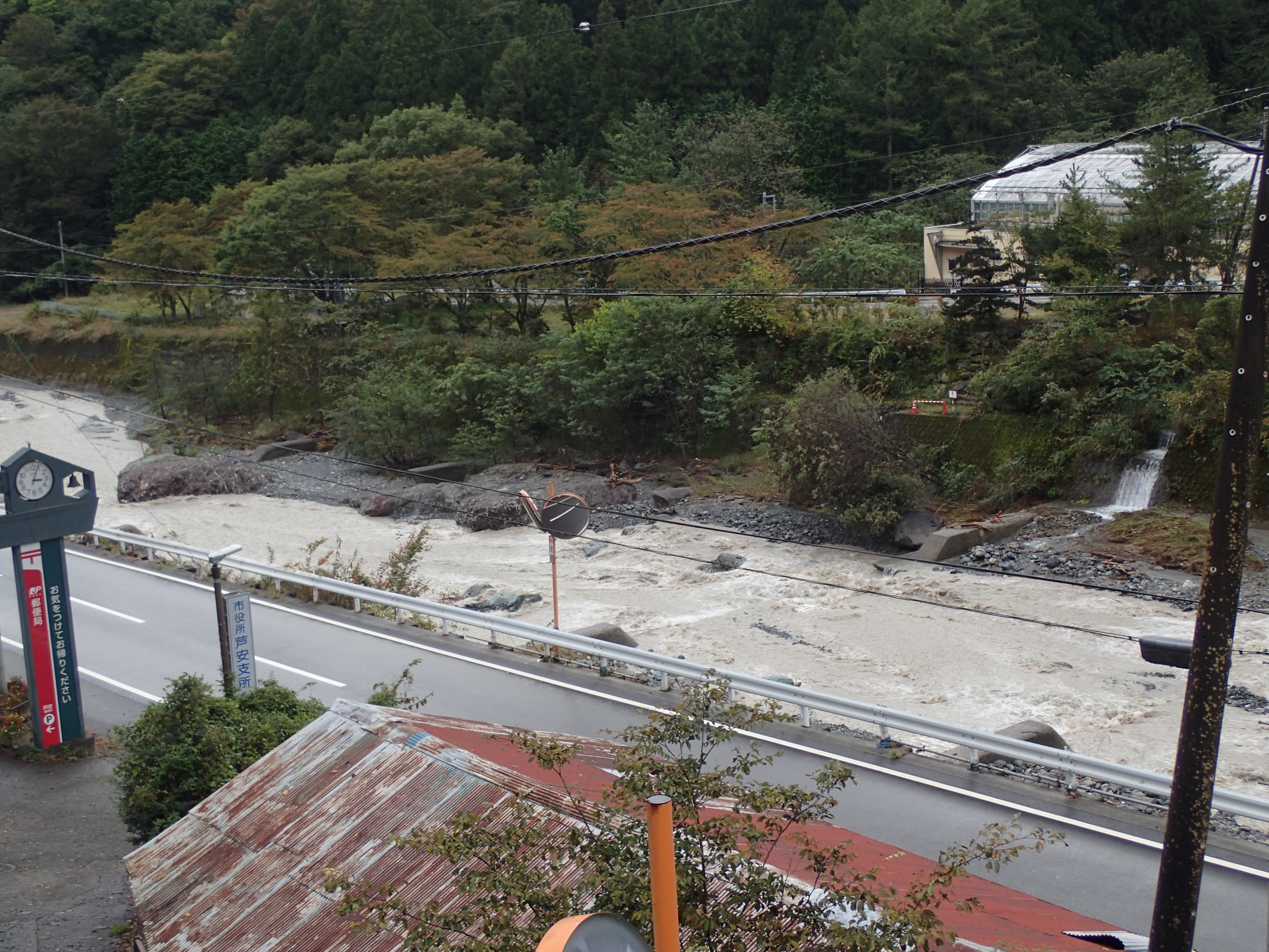 各地で大きな被害をもたらしている台風19号が去ってから1週間ほどが過ぎました。事務所がある芦安を流れる御勅使(みだい)川では台風通過中は水量がかなり増え、流れもとても早くなっていたようです。台風通過後もご覧の通り。