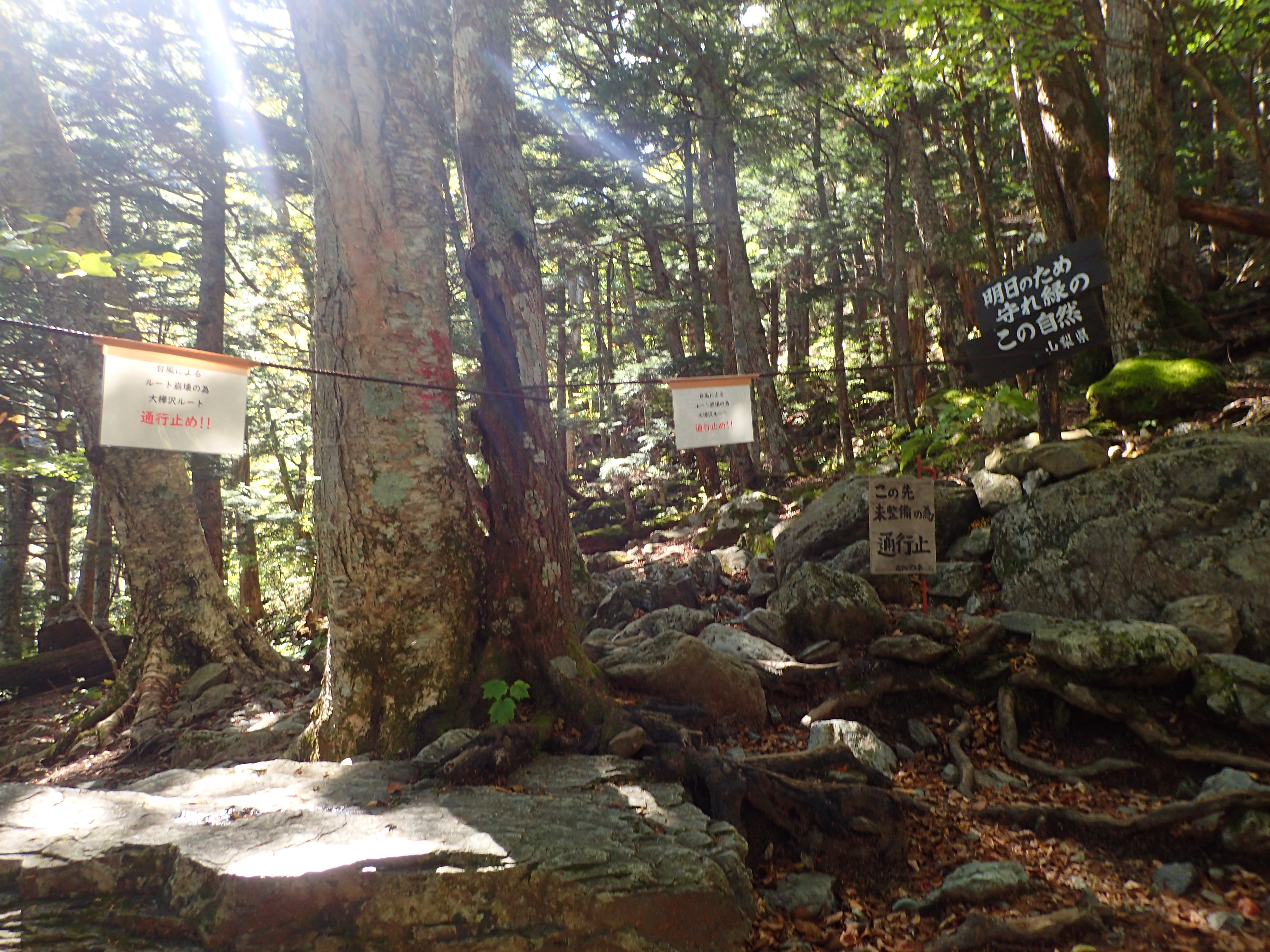 ロープが引っ張ってあるだけなので、くぐれば通過できますが、大樺沢ルートは急流で渡渉をして通過できるような川ではありません。また、右岸も崩落により通行できないルートになっていますので、興味本位だとしてもくぐって大樺沢ルートへは行かないようにしてください。北岳山頂は白根御池小屋経由ルートを使って登山してください。