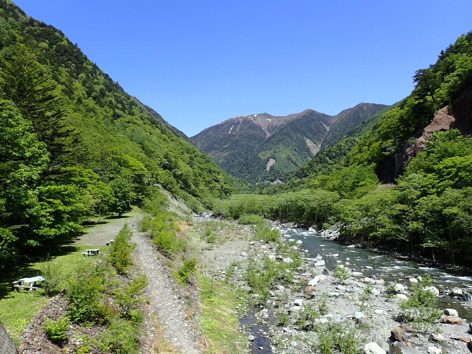 広河原インフォメーションセンターの前を流れる野呂川。北沢峠のほうから水が流れています。左は台風前に撮影したようす。右は通過後。見比べてみてください。