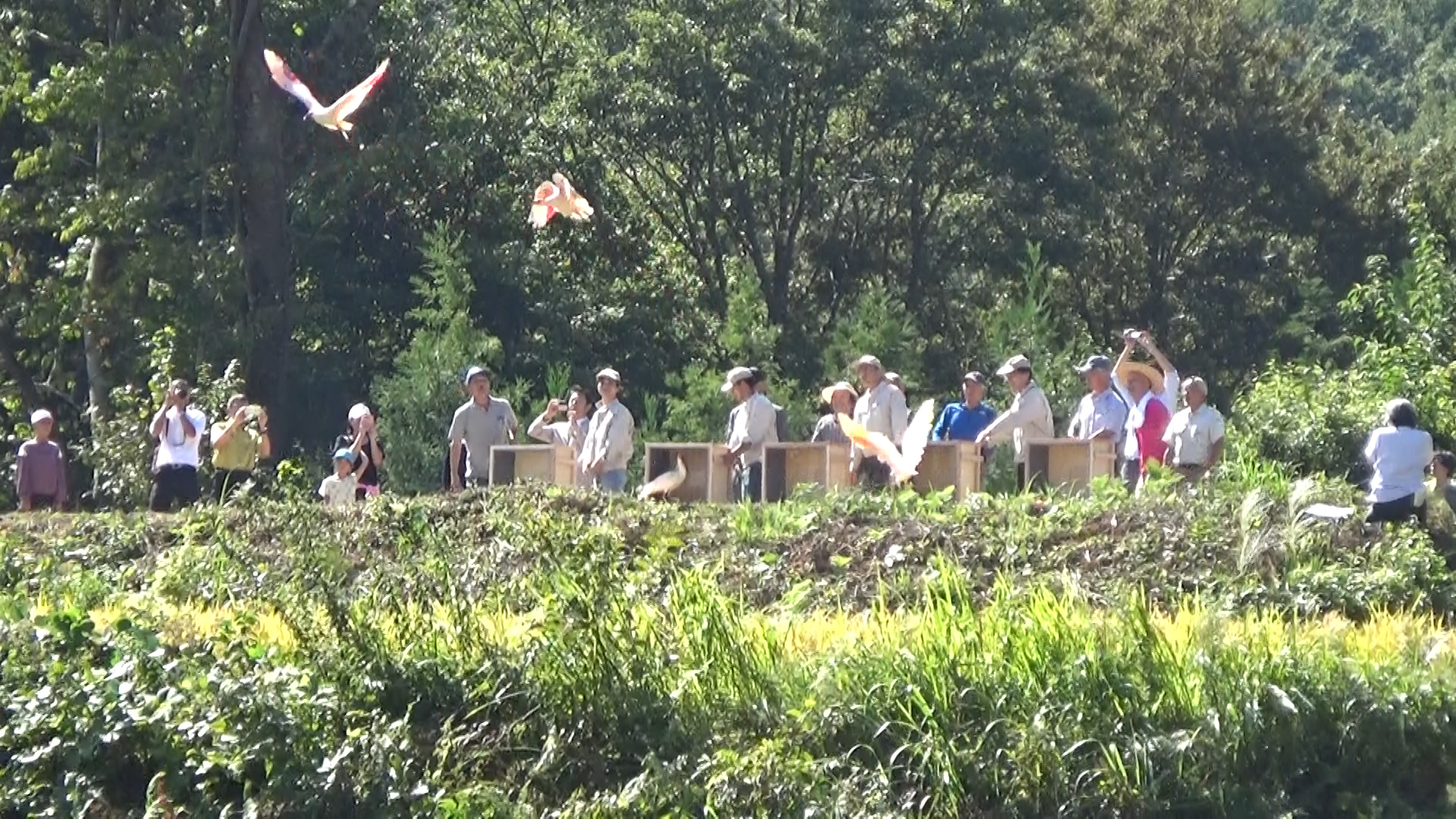 放鳥を見守っていた地域の方々からは 「わあ!綺麗だなあ!」、「みごとだ!」、「歴史的瞬間だ!」などの歓声があがりました。
