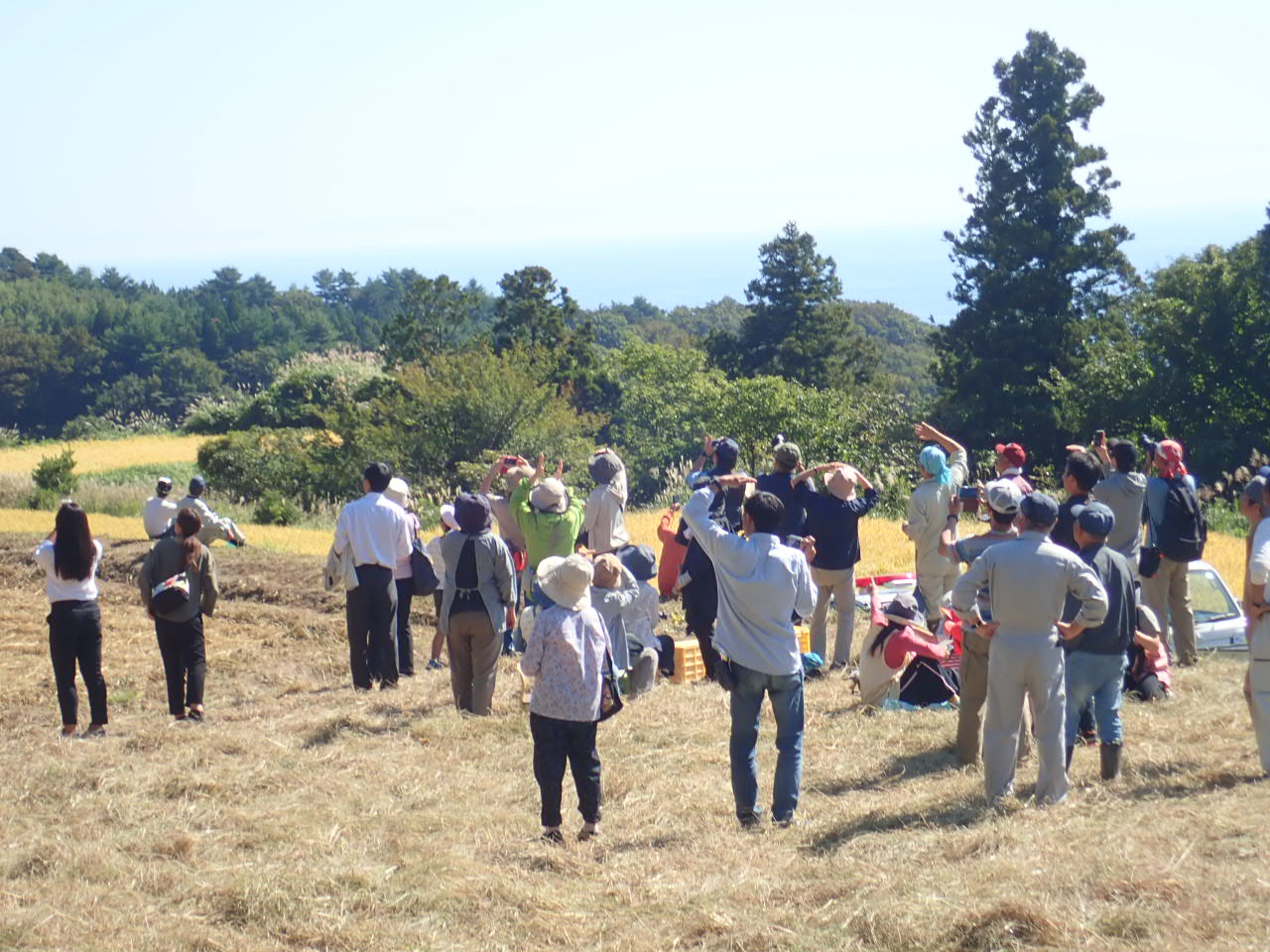 <放鳥されたトキを見上げる地域の方々>