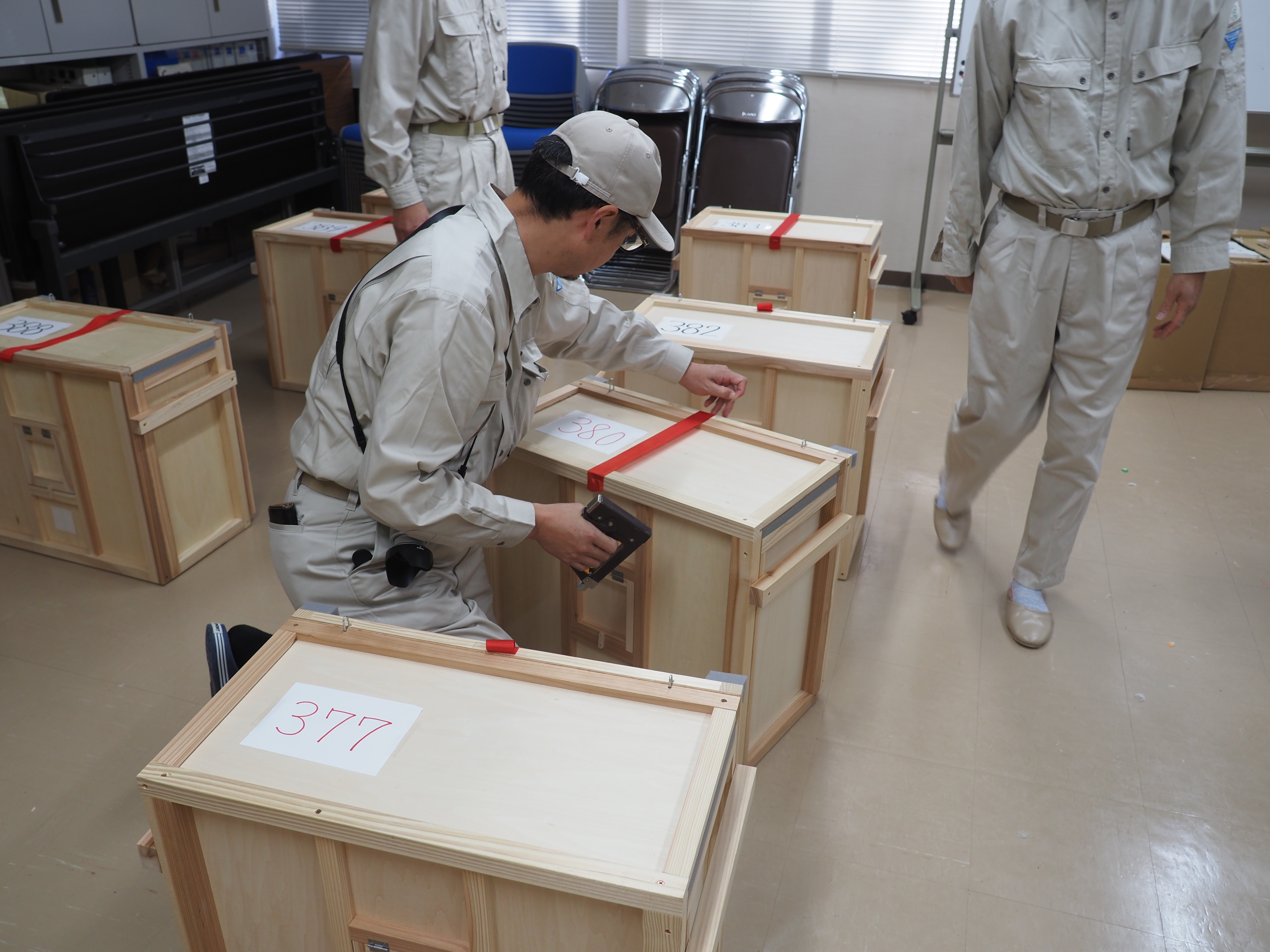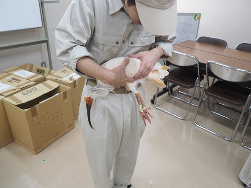 私たちが勤務する佐渡自然保護官事務所は、トキの順化訓練を行う施設「佐渡トキ保護センター野生復帰ステーション」の管理棟内にあります。放鳥当日、ここで放鳥のための順化訓練を受けた17羽のトキのうち10羽を、1羽ずつ箱に入れ、今回の放鳥場所とした片野尾へ運びました。