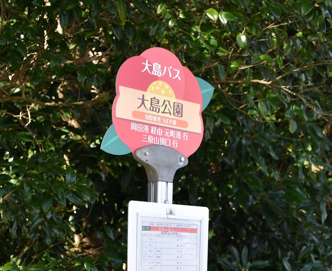 ▲大島公園バス停。ツバキの花がモチーフになっている。