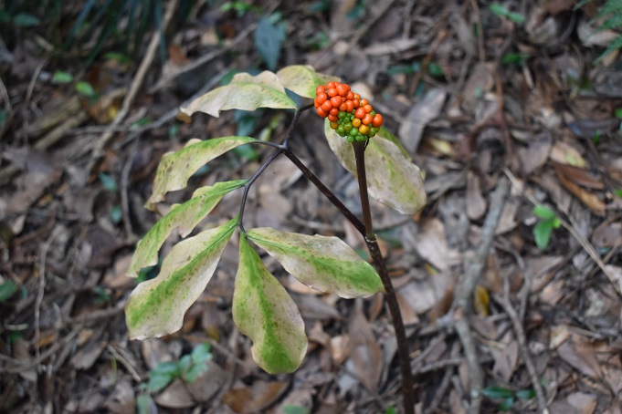 ▲園内の散策路で見つけたテンナンショウの仲間。茎の紫、葉の緑、実のオレンジが綺麗。