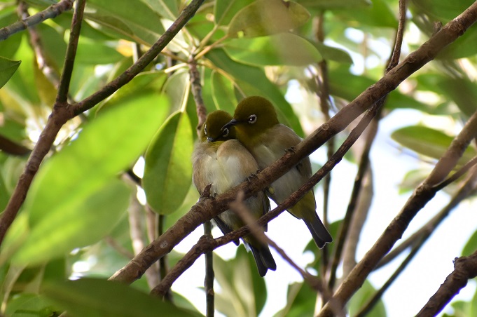 群れが通り過ぎた後、静かになった梢をふと見上げると、二羽のシチトウメジロが枝の上に残って、静かに寄り添っているのを見つけました。互いに羽繕いをしている姿が可愛らしく、幸せな気持ちになりました。