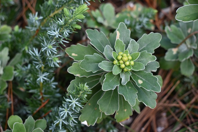 ▲オオシマハイネズ(左)とイソギク(右)。イソギクはまだ開花していなかった。