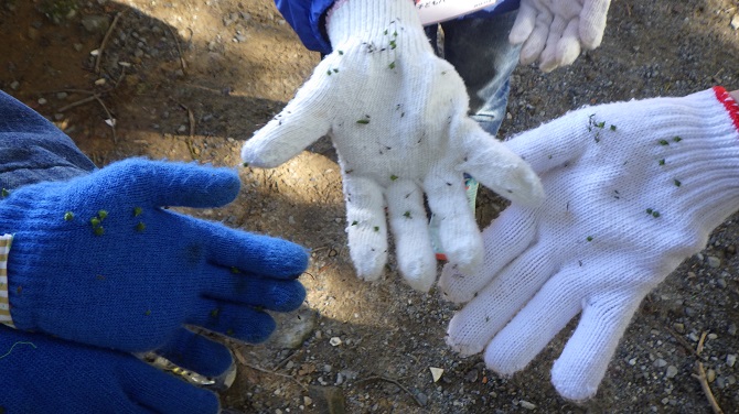 ひっつき虫を軍手に集めて、ルーペで観察しました。