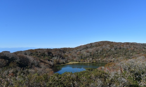 写真のタイトルを見て富士山?と思われた方がいるかもしれませんが、池の中央付近の山の稜線が高くなり始めた辺りに白く雪化粧をした富士山が顔を出しています。天城山は眺望のある場所が少ないですが、天気のいい日は見晴台から、八丁池、富士山を望むことが出来ます。