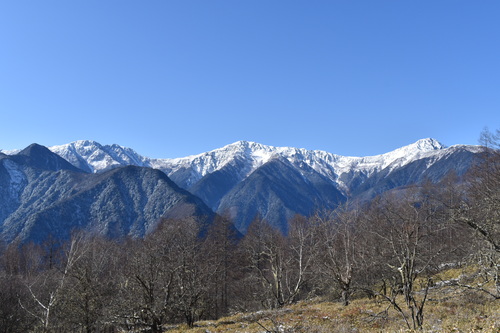 夜叉神峠から見た白峰三山です。昨年よりも雪の付きが良く、白く輝いていました。間ノ岳の中心にある細沢カールにもしっかり雪が付いています。夜叉神峠周辺の木々は葉を落とし、物寂しい雰囲気もありましたが、白くなった白峰三山と雲一つない青空がよく映えていました。夜叉神峠までの登山道はうっすら雪が付いている程度なので、まだアイゼン等は必須ではないかと思います。