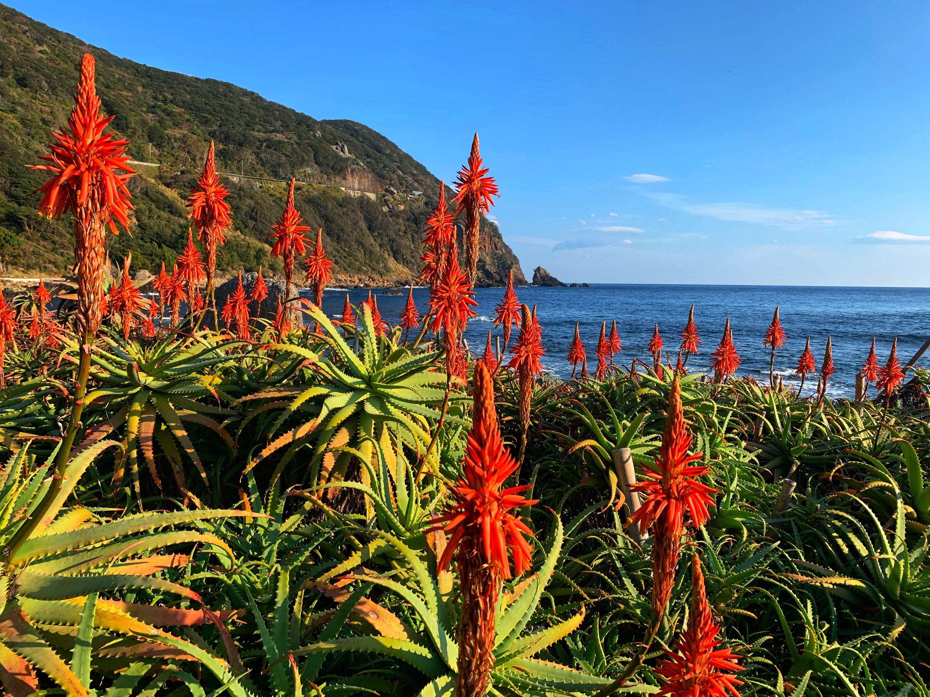 青い海が広がる遊歩道沿いには、およそ3万株のクリスマスツリー。もとい、キダチアロエの花。