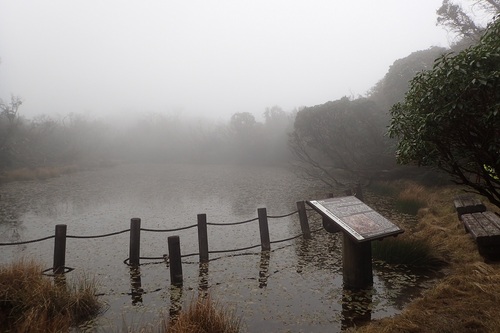 仁科峠から天城峠に向かう途中に、「猫越岳山頂の池」があります。この日は霧に包まれていて幻想的でした。「猫越」は「ねっこ」と読みます。なかなか読めませんよね。名前の由来は、この付近が根っこで覆われているからや、噴火の際に猫が驚いて越えたなど諸説あります。