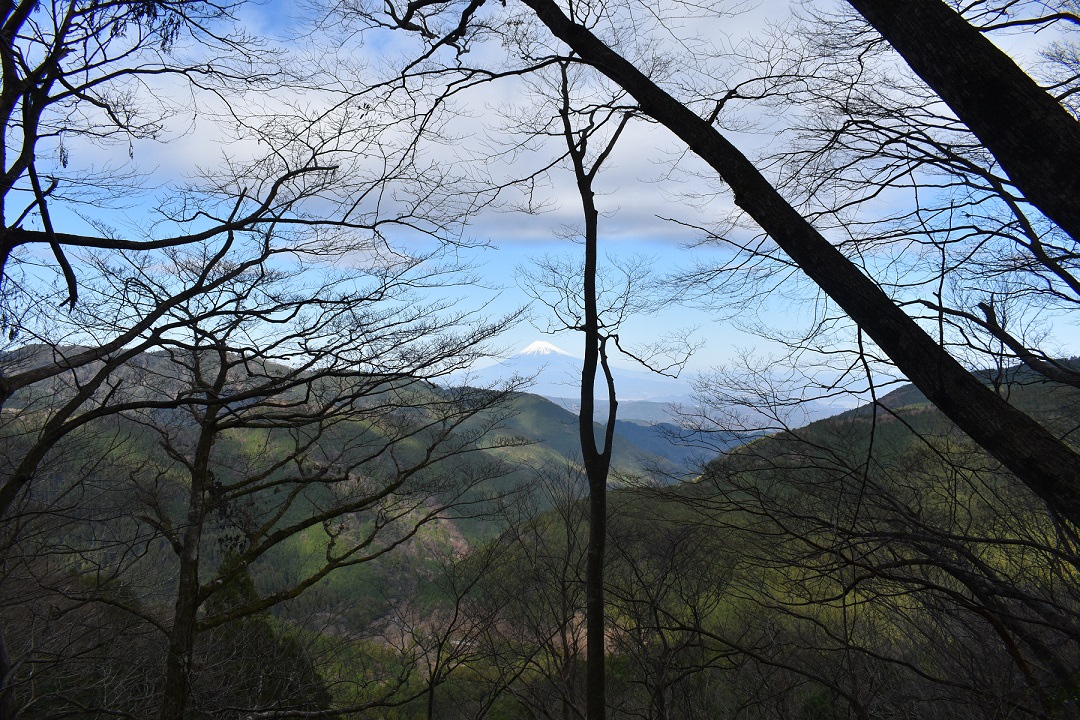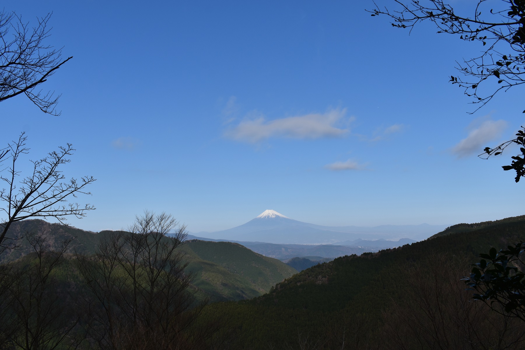 下の①の写真のように落葉した木の枝の隙間から頻繁に富士山を眺めながら歩く事が出来ます。草木が芽吹く頃は②の写真ように木の切れ間から時々見えるくらいです。利用者も少なく歩きやすいですし、冬の空は空気が澄んでいて遠くまでよく見ます。